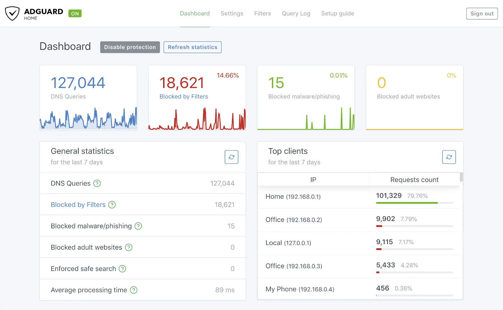 Real-Time Statistics AdGuard Home provides detailed statistics on your network’s DNS queries. This helps you understand which devices are making the most requests and which sites are being accessed frequently.